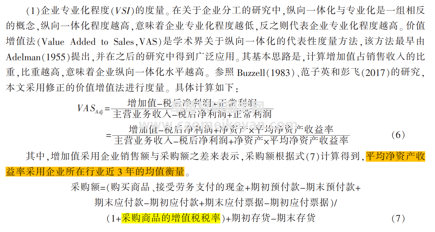 2.测算方式:参考《中国工业经济》袁淳(2021)老师的研究,纵向一体化与专业化是一组相反的概念,纵向一体化程度越高,意味着企业专业化程度越低,反之则代表企业专业化程度越高。价值增值法(Value Added to Sales ,VAS)是学术界关于纵向一体化的代表性度量方法其基本思路是,计算增加值占销售收入的比重,比重越高,意味着企业纵向一体化水平越高。本文采用修正的价值增值法进行度量,具体公式如下图所示