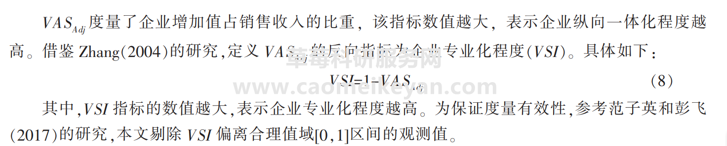 VAS,度量了企业增加值占销售收入的比重,该指标数值越大,表示企业纵向一体化程度越高。定义VASA,的反向指标为企业专业化程度(VSI)。具体如下:V Sl=1-VASA,VSI指标的数值越大,表示企业专业化程度越高。为保证度量有效性,参考范子英和彭飞(2017)的研究,本文剔除VSI 偏离合理值域[0,1]区间的观测值