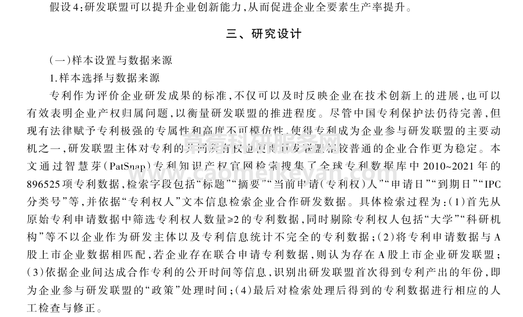 2.测算方式:参考《数量经济技术经济研究》杜传忠(2024)老师的做法,本文通过智慧芽(PatSnap)专利知识产权官网检索搜集了全球专利数据库中2023~2008年的专利数据,检索字段包括“标题”“摘要”“当前申请(专利权)人”“申请日”“到期日”“IPC分类号”等,并依据“专利权人”文本信息检索企业合作研发数据。具体检索过程为:(1)首先从原始专利申请数据中筛选专利权人数量≥2的专利数据,同时剔除专利权人包括“大学”“科研机构”等不以企业作为研发主体以及专利信息统计不完全的专利数据;(2)将专利申请数据与A股上市企业数据相匹配,若企业存在联合申请专利数据,则认为存在A股上市企业研发联盟;(3)依据企业间达成合作专利的公开时间等信息,识别出研发联盟首次得到专利产出的年份,即为企业参与研发联盟的“政策”处理时间;(4)最后对检索处理后得到的专利数据进行相应的人工检查与修正。具体做法如下图所示