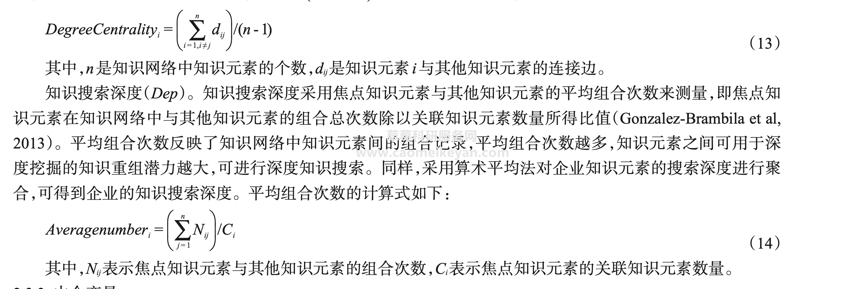 知识搜索深度 ( Dep )。知识搜索深度采用焦点知识元素与其他知识元素的平均组合次数来测量, 即焦点知识元素在知识网络中与其他知识元素的组合总次数除以关联知识元素数量所得比值 ( Gonzalez-Brambila et al,2013 )。平均组合次数反映了知识网络中知识元素间的组合记录, 平均组合次数越多, 知识元素之间可用于深度挖掘的知识重组潜力越大, 可进行深度知识搜索。同样, 采用算术平均法对企业知识元素的搜索深度进行聚合, 可得到企业的知识搜索深度。具体做法及公式如下图文献所示